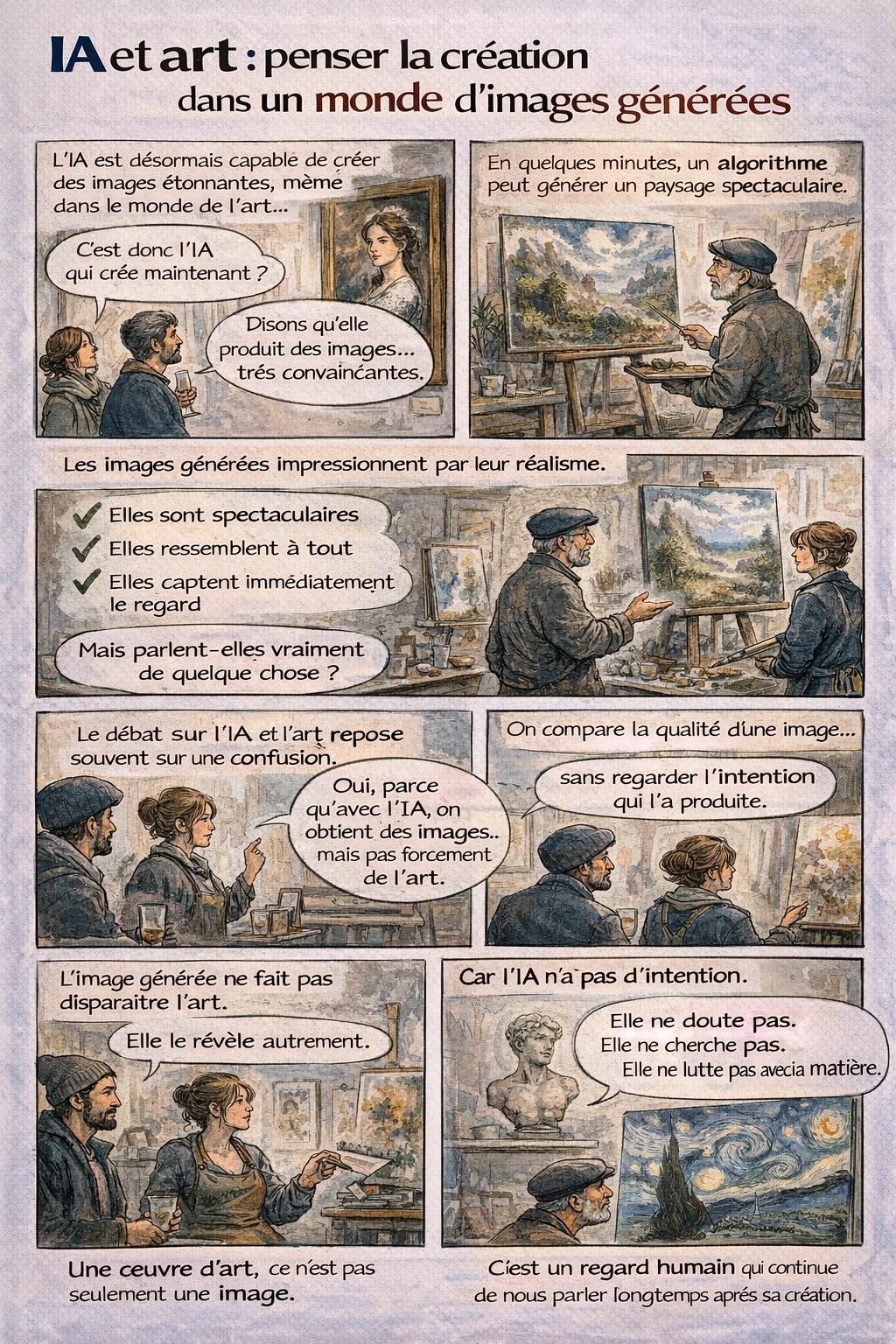 Dans un atelier baigné de lumière, un peintre observe une image générée en quelques secondes par un algorithme. Le résultat est impeccable. Les couleurs vibrent. La composition est équilibrée. Le réalisme est saisissant.
